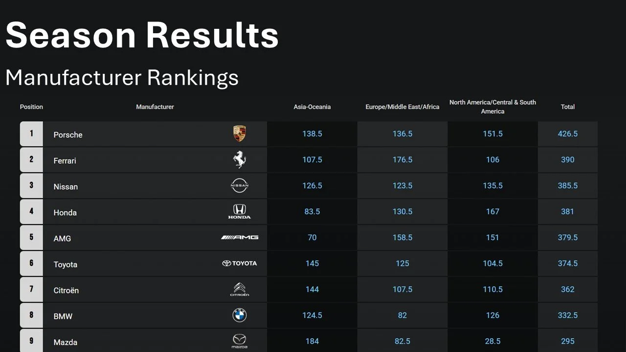 Porsche secured the Manufacturer’s Championship globally, finishing ahead of Ferrari and Nissan. Congratulations to all my fellow Porsche drivers this series!